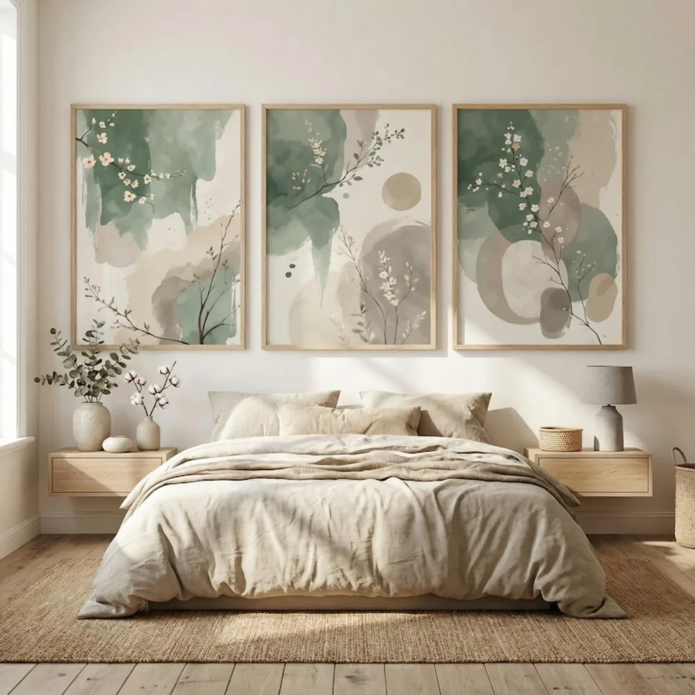 3pcs Frameless Japanese Plant Wall Art,Abstract Watercolor Leaves,Sage Green Beige Prints,Modern Zen Decor,Digital Download
