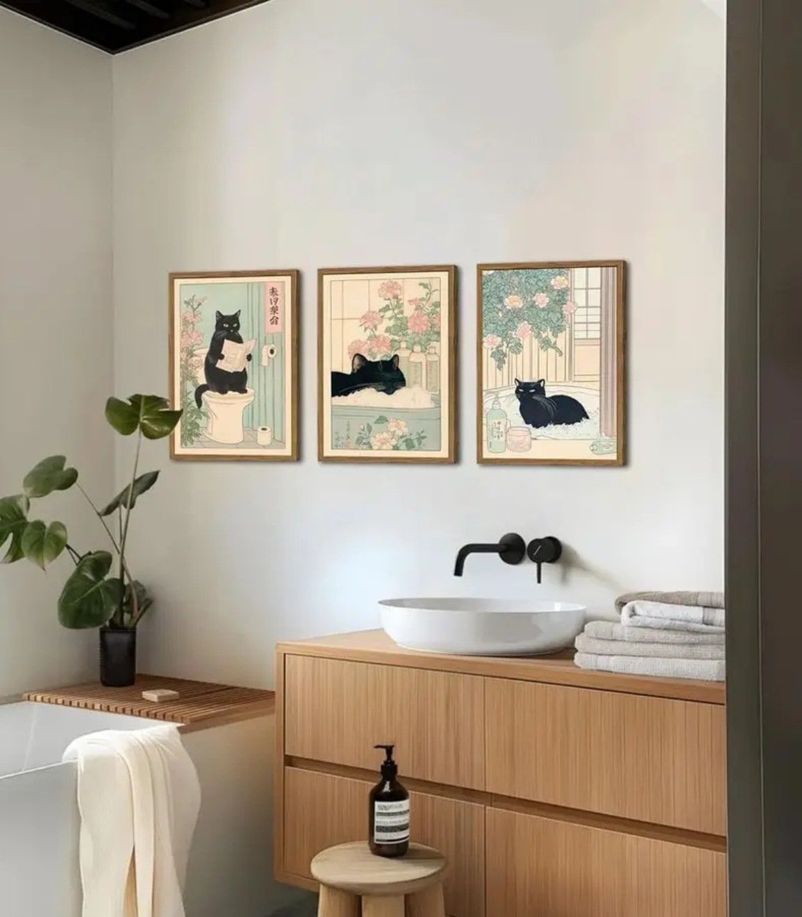 Japanese Bathroom Wall Art Set of 3, Funny Black Cat in Bathtub and Toilet Pictures Wall Decor Paintings, Vintage Cute Animal Ca
