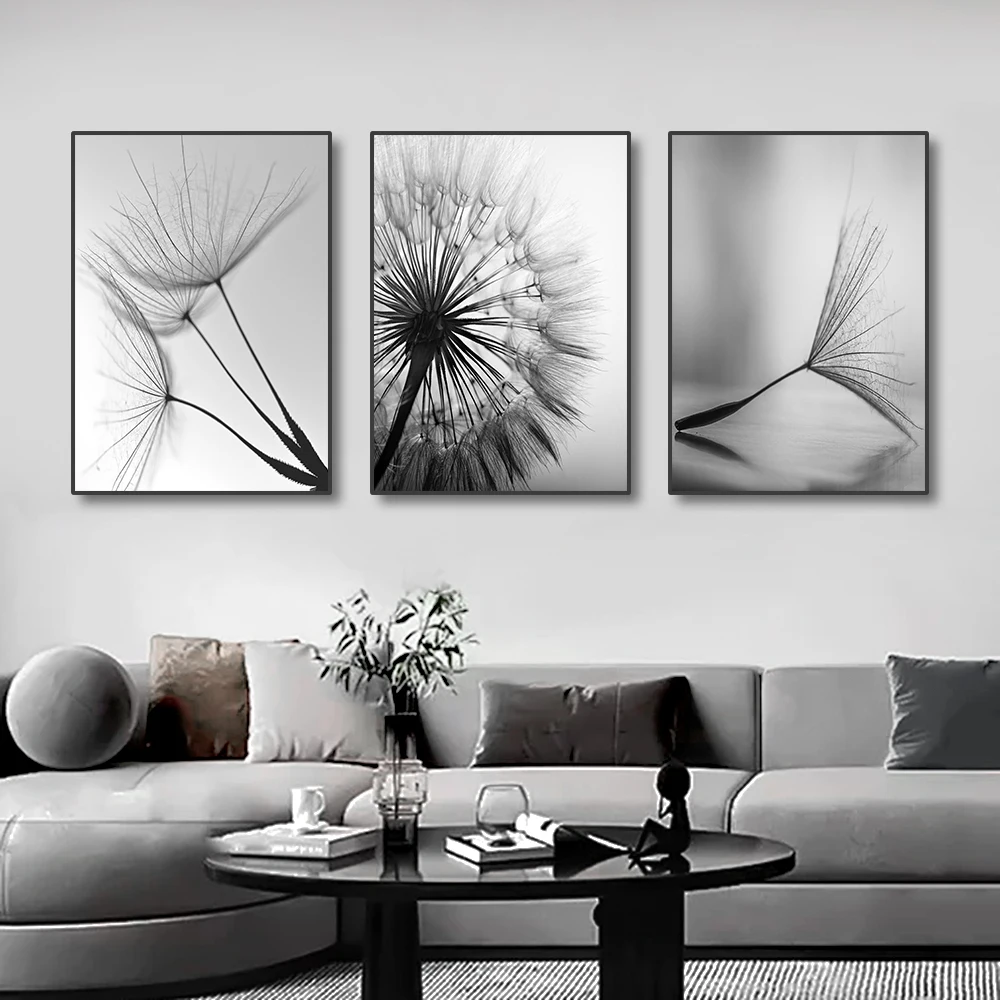 3PCS Black and White Wall Art Canvas Painting Dandelion Flower Pictures Poster and Prints Home Decorative Artworks for Kitchen