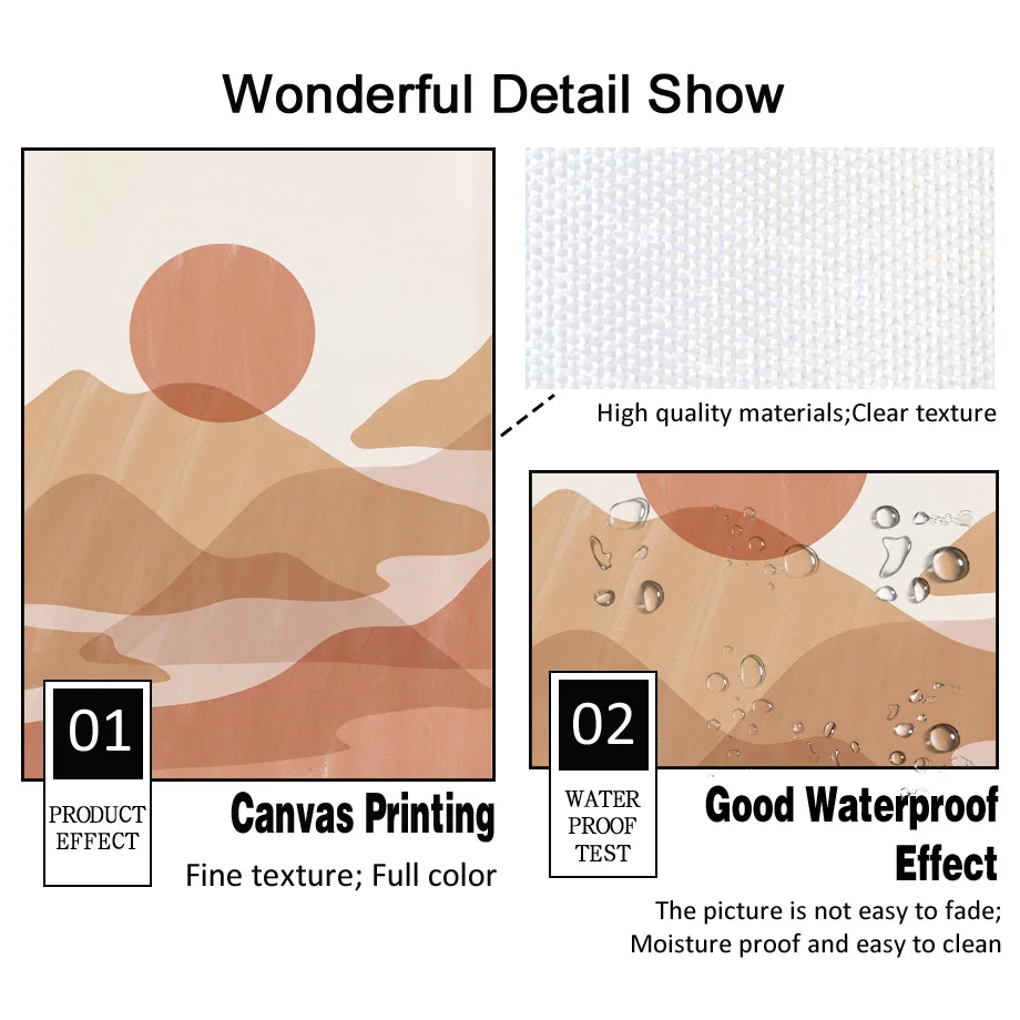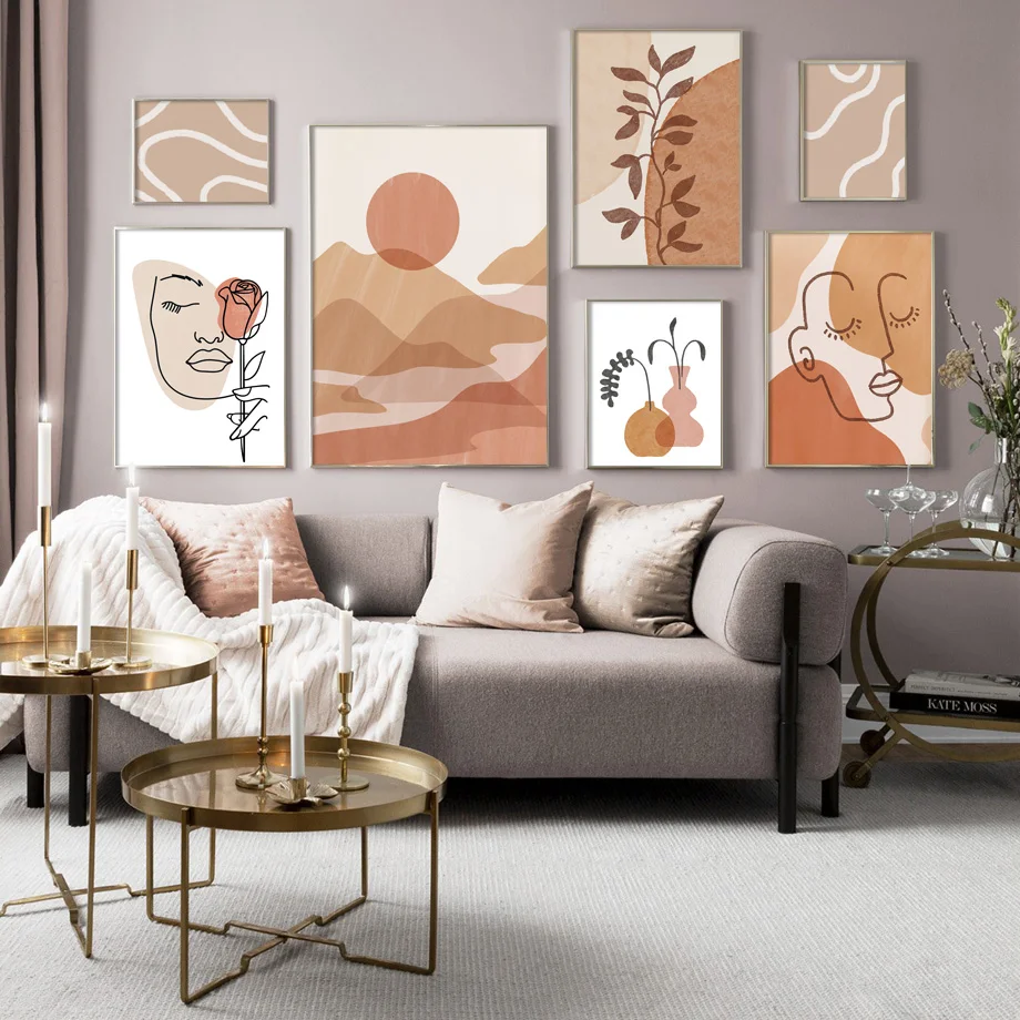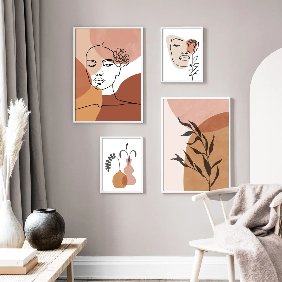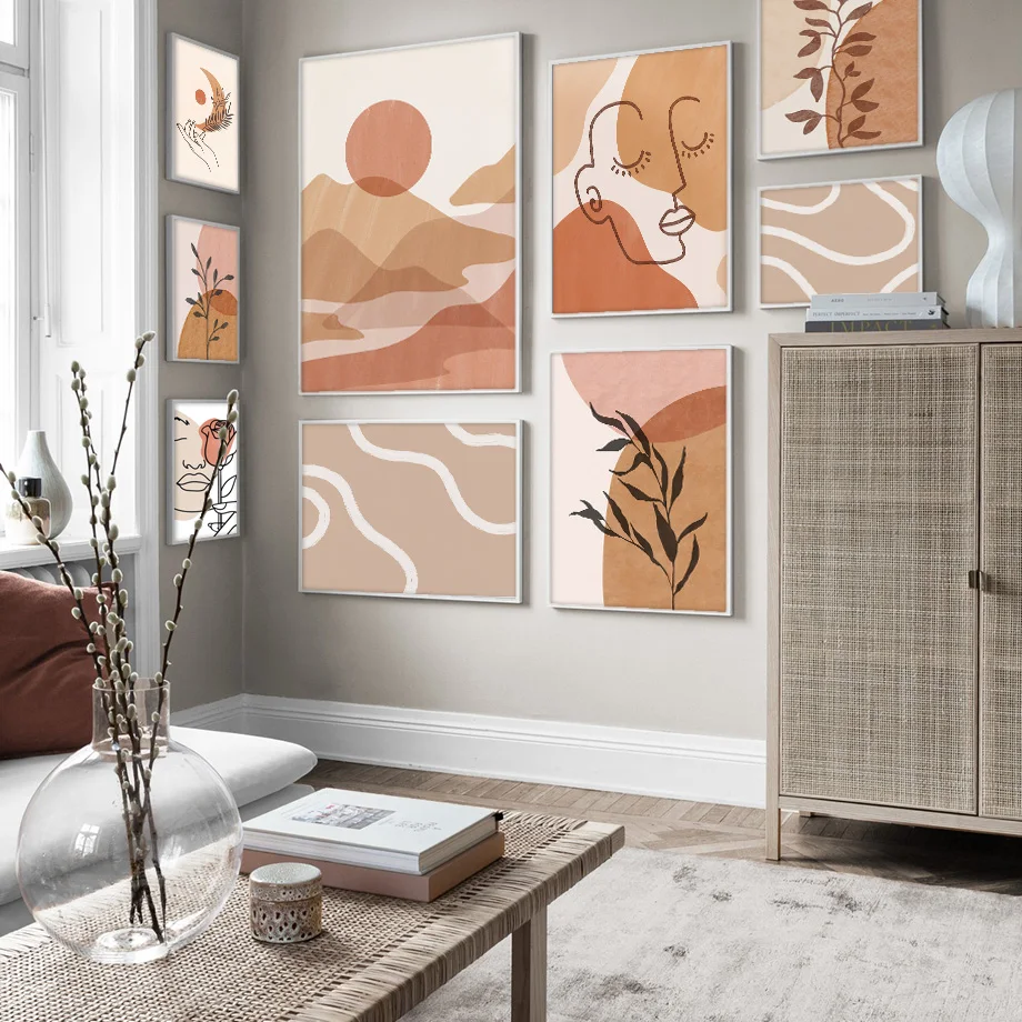 Boho Neutral Wall Art Print Abstract Terracotta Sun Mountain Poster Minimalist Line Art Woman Face Leaf Canvas Decor Living Room