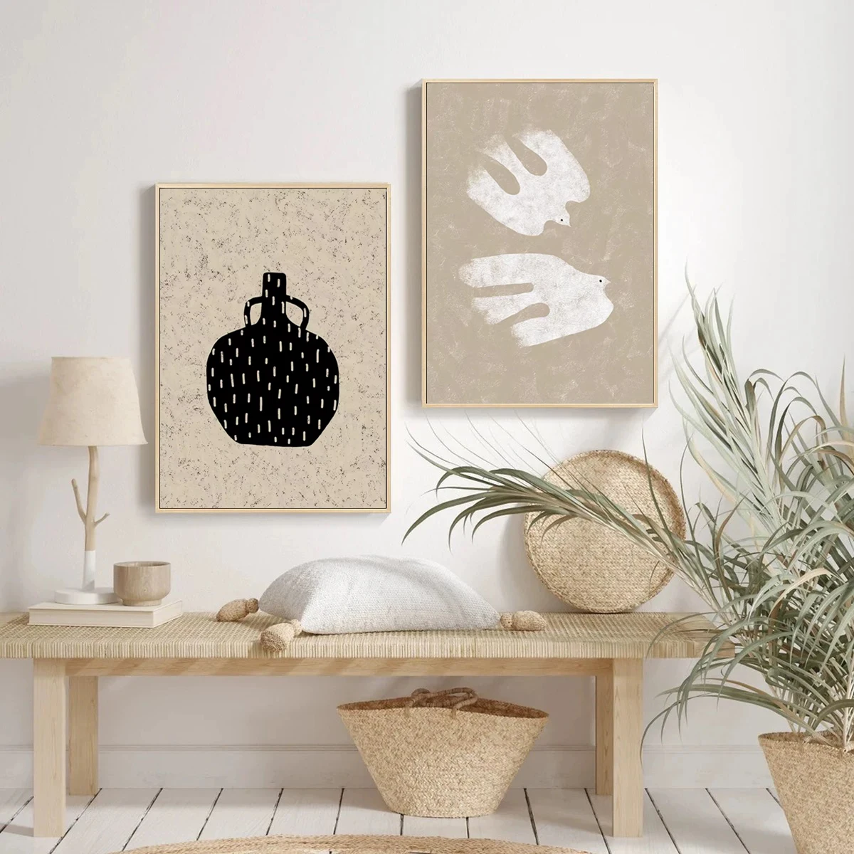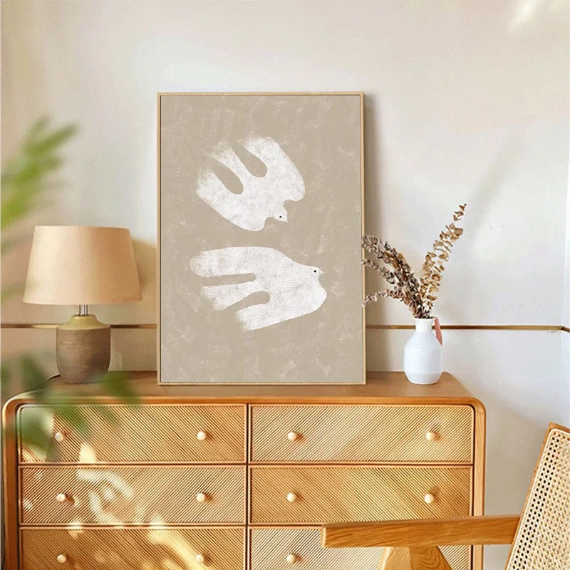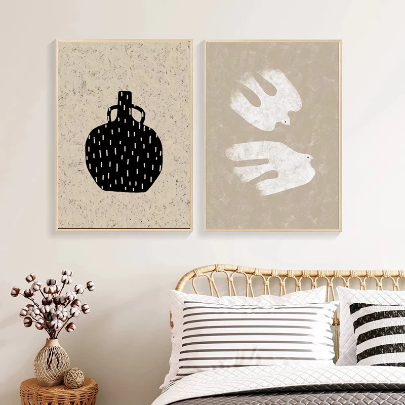 Minimalist Nordic Style Natural Linen Texture Bird Flying Salt Series Ceramic Jar Matte Oil Painting Canvas Decorative Artwork
