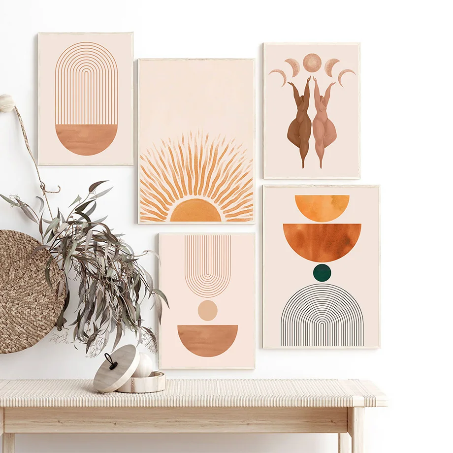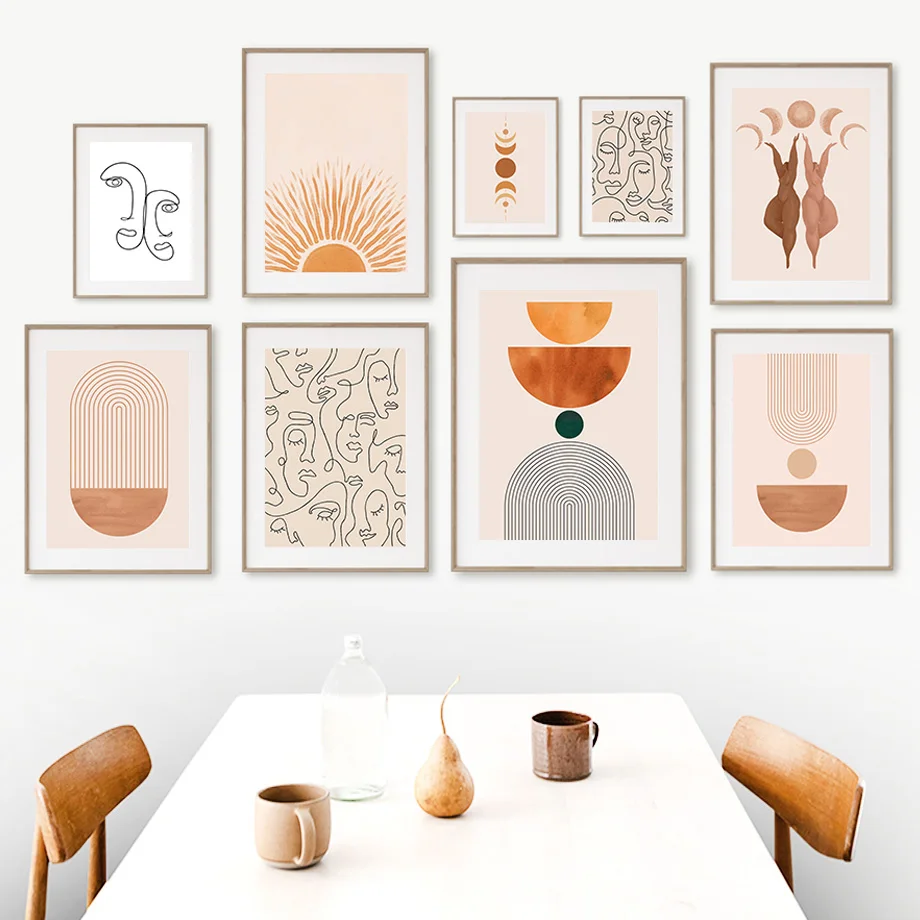 Neutral Boho Wall Art Prints Sun Moon Phase Abstract Face Line Art Posters Minimalist Geometric Female Body Living Room Decor