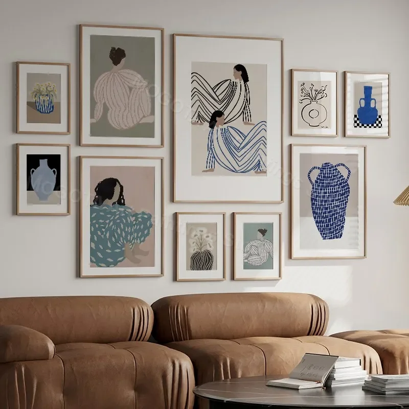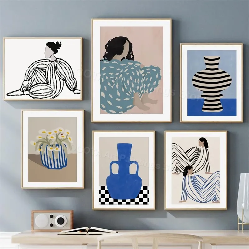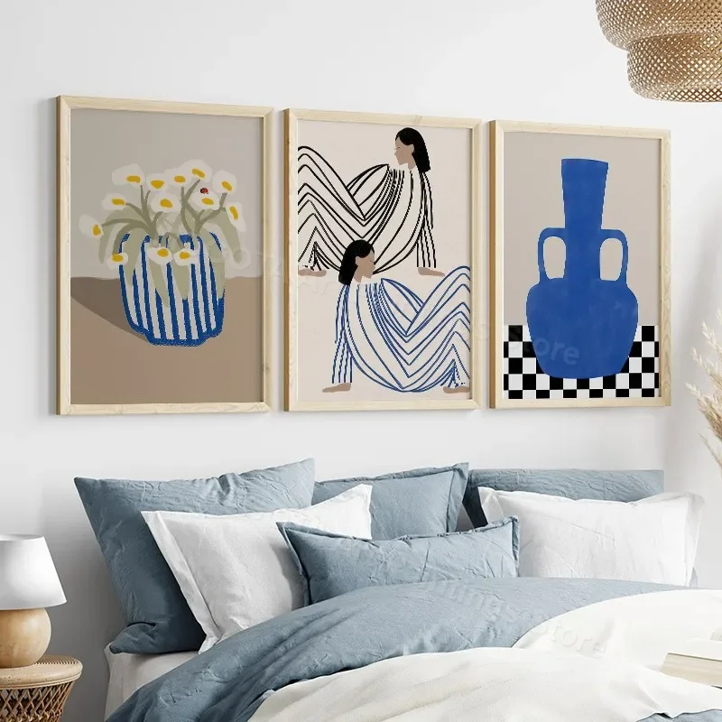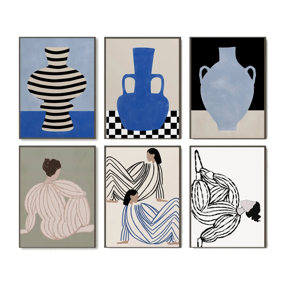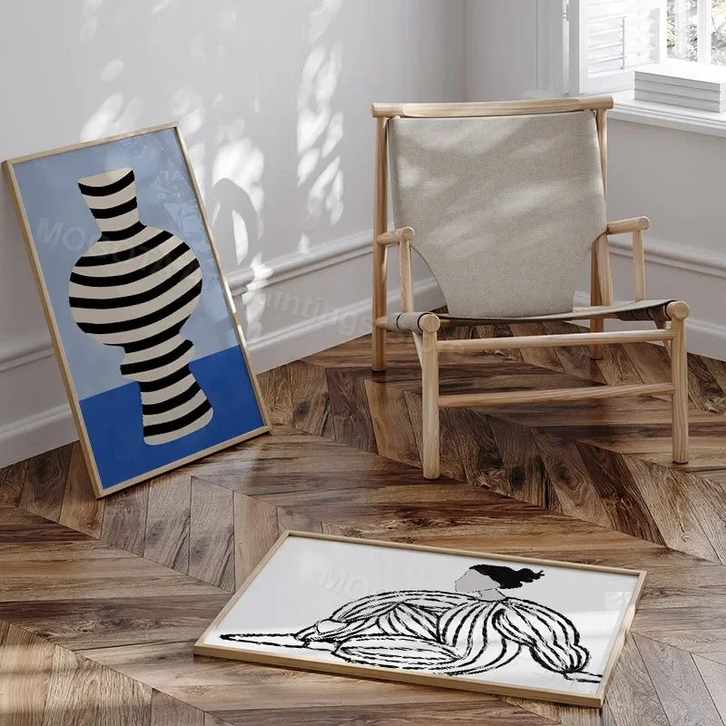 Retro Abstract Line Curve Girl Vase Modern Gallery Wall Art Prints Canvas Painting Minimalist Posters Pictures Living Room Decor